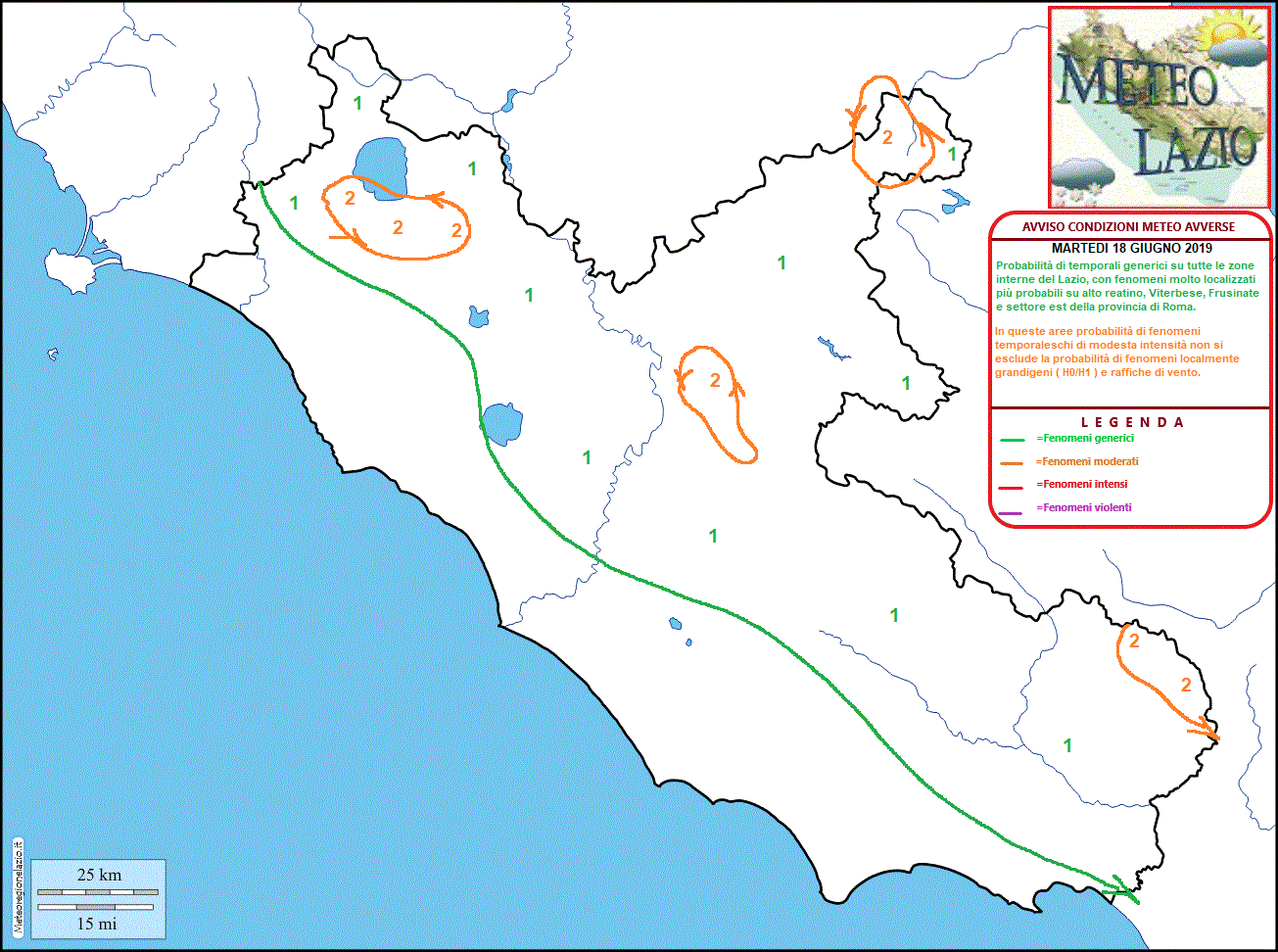 FENOMENI MODERATI LIV.2: Possibilità di temporali di modesta intensità su diverse aree interne in particolare su basso Frusinate, settore est della provincia di Roma, Reatino e alto Viterbese. In queste aree possibilità di grandinate lievi o di piccole dimensioni ( H0/H1 ), con raffiche di vento. Anche su queste aree i fenomeni si attenueranno verso il tardo pomeriggio.