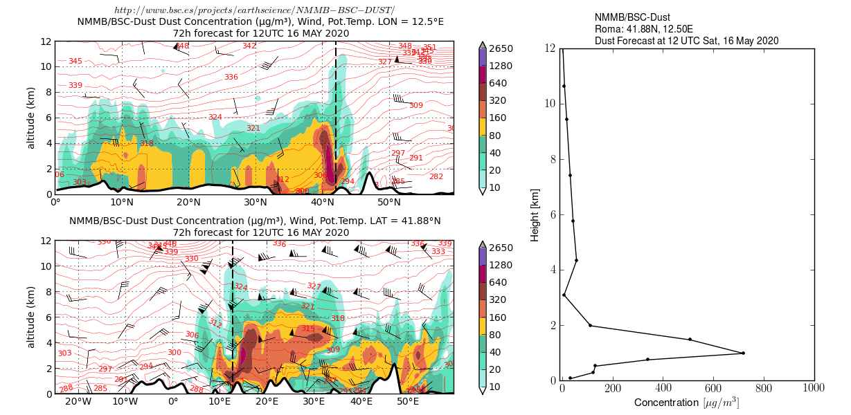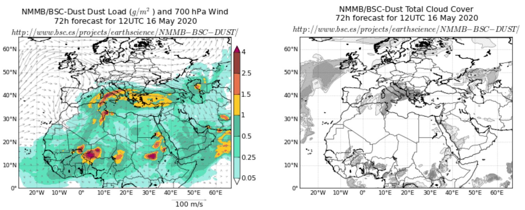 (Le previsioni delle polveri desertiche stimate nelle elaborazioni modellistiche BSC-Dream dal pomeriggio di sabato 16 maggio)
