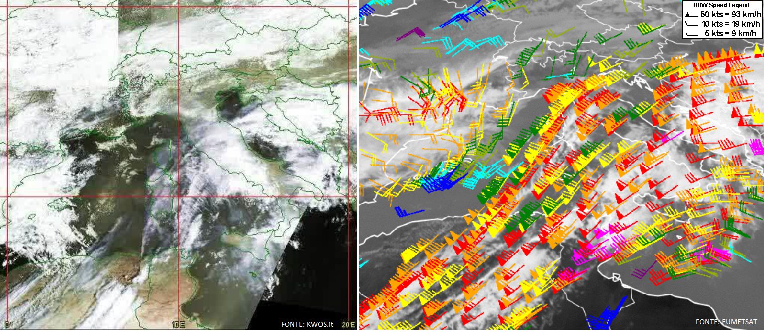 Inoltre gli intensi venti di scirocco hanno trasportato verso l’Italia la polvere sahariana, apprezzabile e osservabile mediante l’immagine da satellite polare MetOp gentilmente concessa e resa disponibile dal sito KWOS.it di Raffaello di Martino riferita a giovedì 14 maggio.