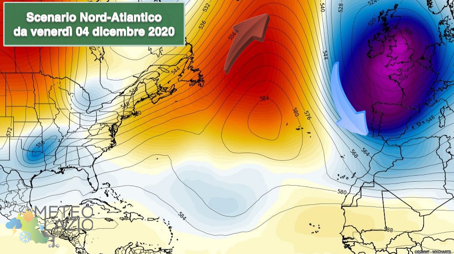 Infatti sull’oceano Atlantico andrà a formarsi un massiccio blocco anticiclonico, con uno scambio meridiano alle latitudini polari e una deviazione del flusso perturbato principale in direzione del Mar Mediterraneo e l’Italia.