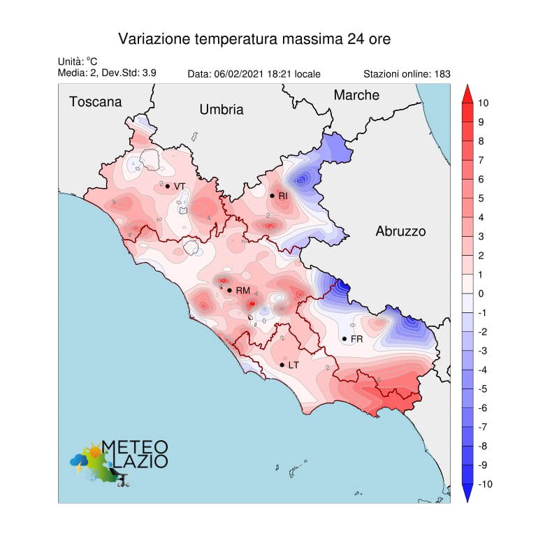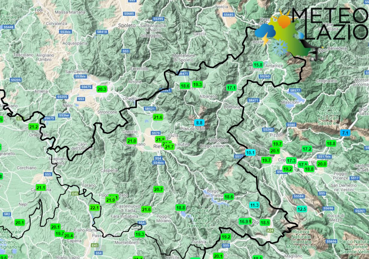 L’aumento termico ha riguardato ugualmente l’entroterra laziale, da Rieti a Frosinone, con valori termici positivi vicinissimi o superiori ai 10°C perfino in alta montagna al di sopra dei 1.500 metri s.l.m. ovvero su quelle sezioni montuose dove permane uno strato nevoso consistente.