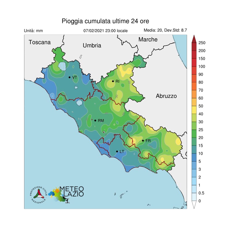 Mentre sulle restanti zone l’apporto precipitativo risulta compreso tra i 30-40 mm (Appennino di Rieti, zone Est di Roma e Cassinate).