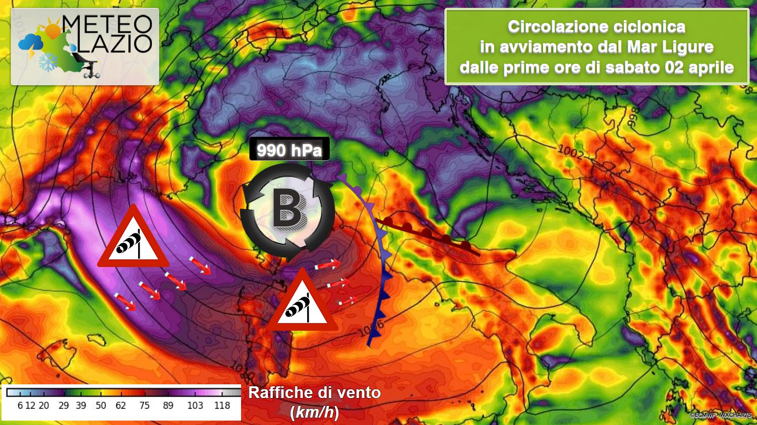Sulle regioni settentrionali andranno a collocarsi diversi minimi di bassa pressione al suolo, tra cui il più profondo che toccherà da venerdì notte i 990 hPa in corrispondenza del Mar Ligure.