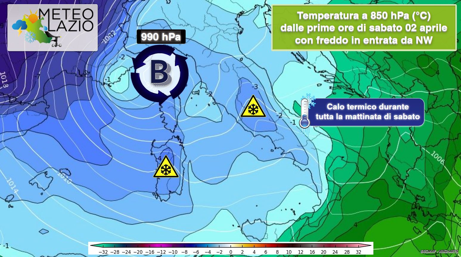 I gradienti barici nel corso della mattinata di sabato saranno all’origine della sostenuta ventilazione in rapido movimento di Ponente assai fredda in medio-alta atmosfera in direzione del Lazio.