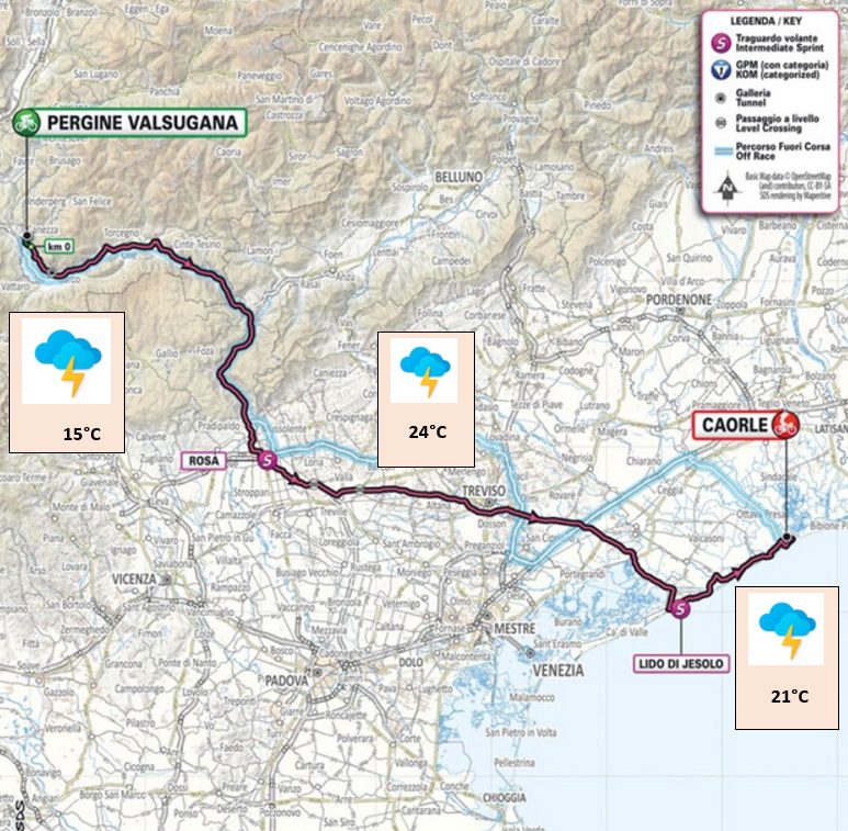 Passiamo alla 17a tappa, la Pergine Valsugana-Caorle di 197 km, interamente pianeggiante. E’ una delle ultime possibilità per i velocisti. Difficile, infatti, che oggi possa andare in porto una fuga. Verranno attraversate le province di Trento, Vicenza, Treviso e Venezia. Previsti due traguardi volanti a Rosà, al chilometro 83, e a Lido di Jesolo, al chilometro 165. Bello il finale, tutto sul mare.