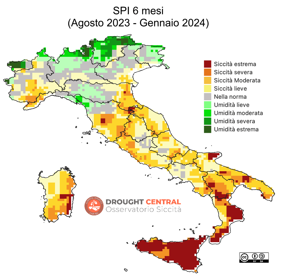 La stagione invernale 2023-2024 ha registrato un deficit di neve senza precedenti in Italia, con dati rilevati dalla Fondazione CIMA che mostrano un declino del 64% nello Snow Water Equivalent (SWE) a livello nazionale. Tale situazione risulta piuttosto preoccupante specie al centro-sud come è possibile osservare dalla grafica dell’SPI (Standard Precipitation Index ). Anche in Sicilia, nonostante gli ultimi eventi precipitativi e le prime nevicate stagionali sui rilievi, queste ultime sono seguite da un rapido scioglimento, non fornendo un contributo positivo alla carenza idrica attuale.