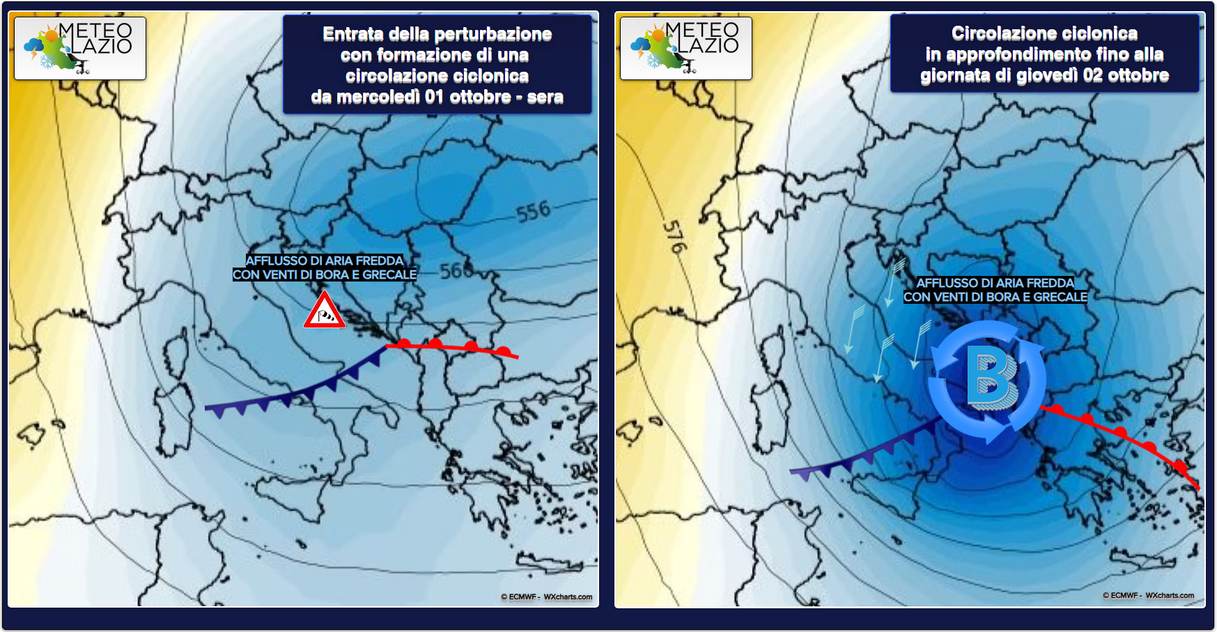 Dal 1° ottobre la circolazione ciclonica, posta a ridosso dei Balcani, trasporterà verso il Mar Adriatico e parte delle regioni centrali italiane un impulso perturbato, con l’ingresso di sostenute correnti di Bora da NE e di Grecale sul medio versante adriatico.