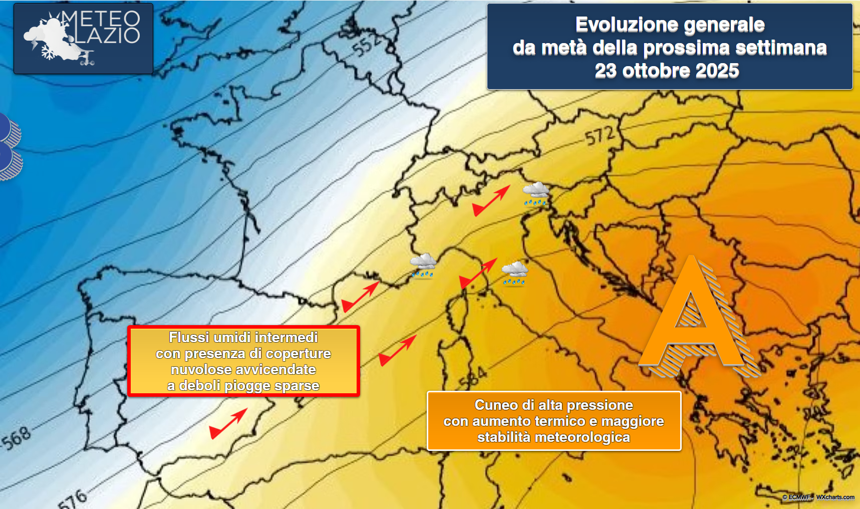 Contestualmente si assisterà al rinforzo di un cuneo di alta pressione subtropicale, in attesa di un nuovo impulso perturbato che potrebbe farsi strada verso il Mediterraneo occidentale entro il prossimo weekend (24–25–26 ottobre).
