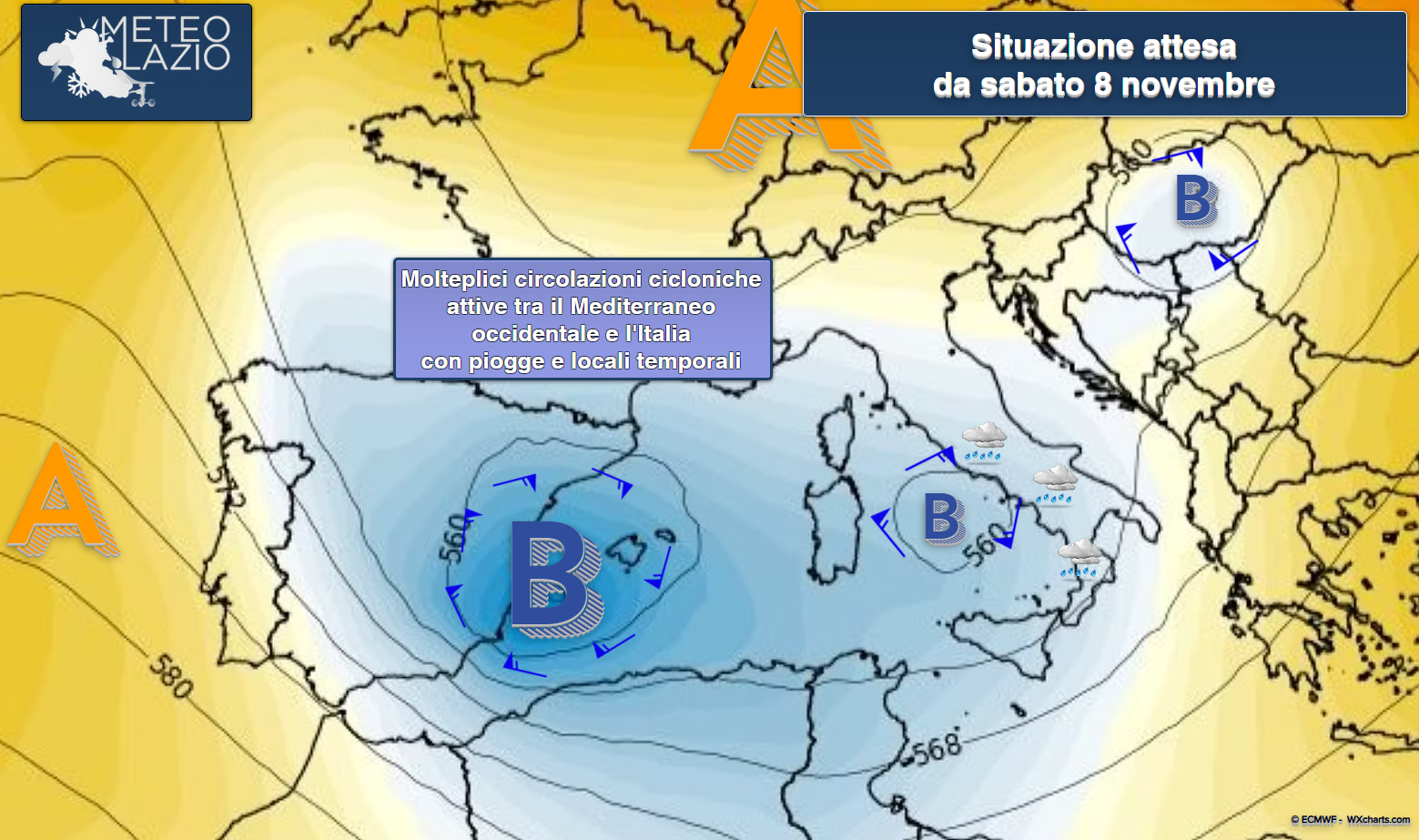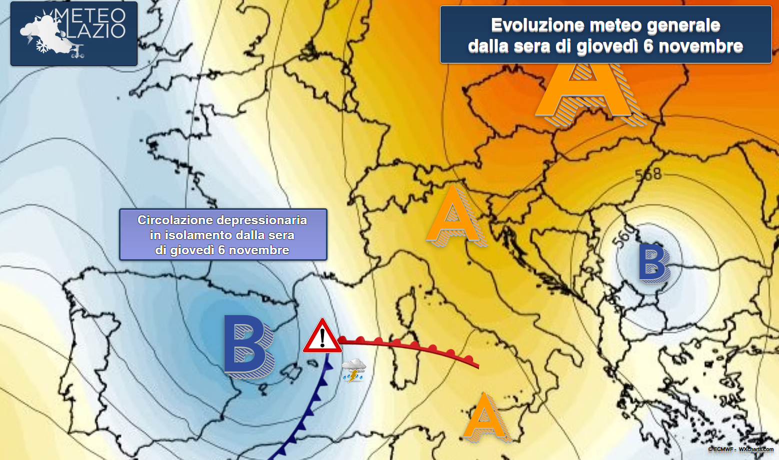 Entro venerdì 7 novembre un impulso atlantico spingerà una perturbazione dalla Spagna verso il Mediterraneo occidentale, dove assisteremo probabilmente all’evoluzione di una circolazione ciclonica nei pressi della Sardegna e, successivamente, sul Mar Tirreno centrale. Qui tenderà a persistere un rinnovamento dell’instabilità atmosferica, con conseguenti formazioni temporalesche che, entro il fine settimana, potranno interessare le coste tirreniche centro-meridionali della Penisola.