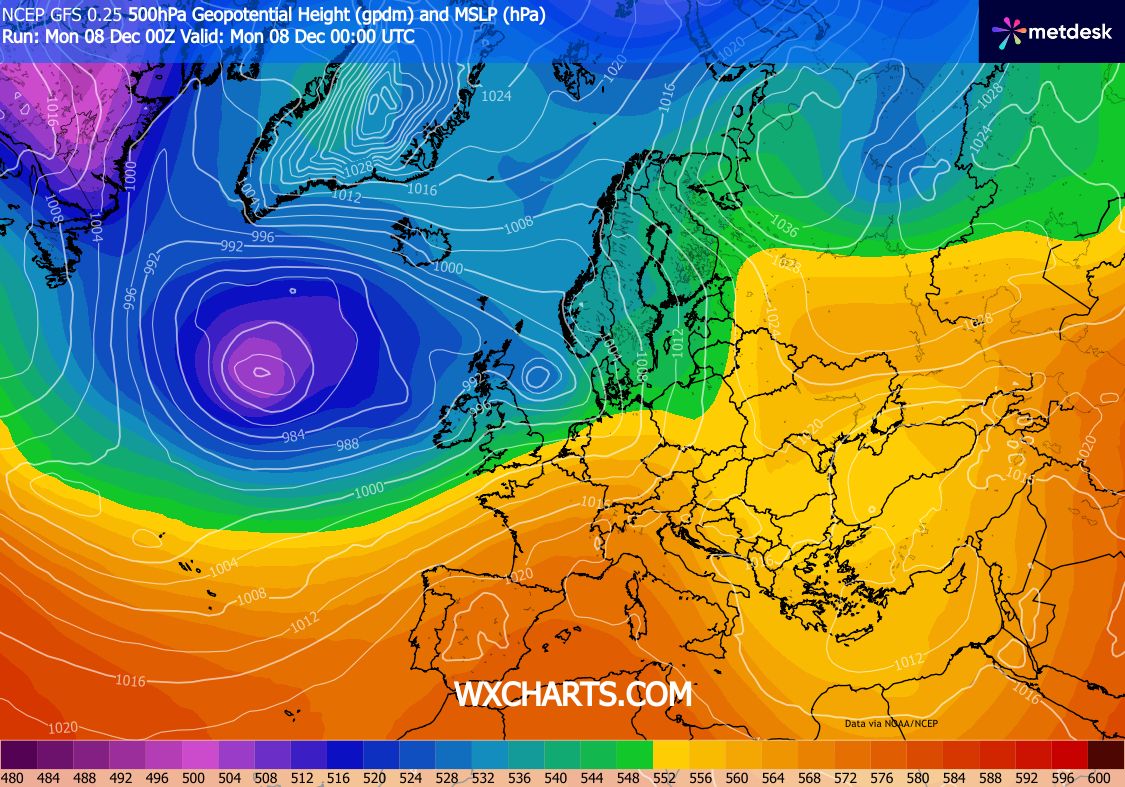 Con Dicembre si chiude la parentesi fredda sul Mediterraneo centrale di fine Novembre. L’anticiclone delle Azzorre che si era consolidato sull’oceano a fine Novembre ora perde di nuovo forza. Si rinforzano invece le depressioni atlantiche in transito dagli Stati Uniti verso l’Europa centrale. Sebbene la ripresa dei venti zonali sia dovuto a variabilità naturale (come indicato da Nucera, GLAAM+ e MJO), c’è da notare e sottolineare come ancora una volta la storm track, ossia il percorso delle depressioni atlantiche, sia più basso del normale. Dalle carte dei modelli globali infatti si può ben notare come i profondi vortici atlantici continuino a richiamare aria calda e momento antizonale verso la Groenlandia, con le temperature e geopotenziali sul mar del Labrador insistentemente sopra la media (Immagine 1, 2).