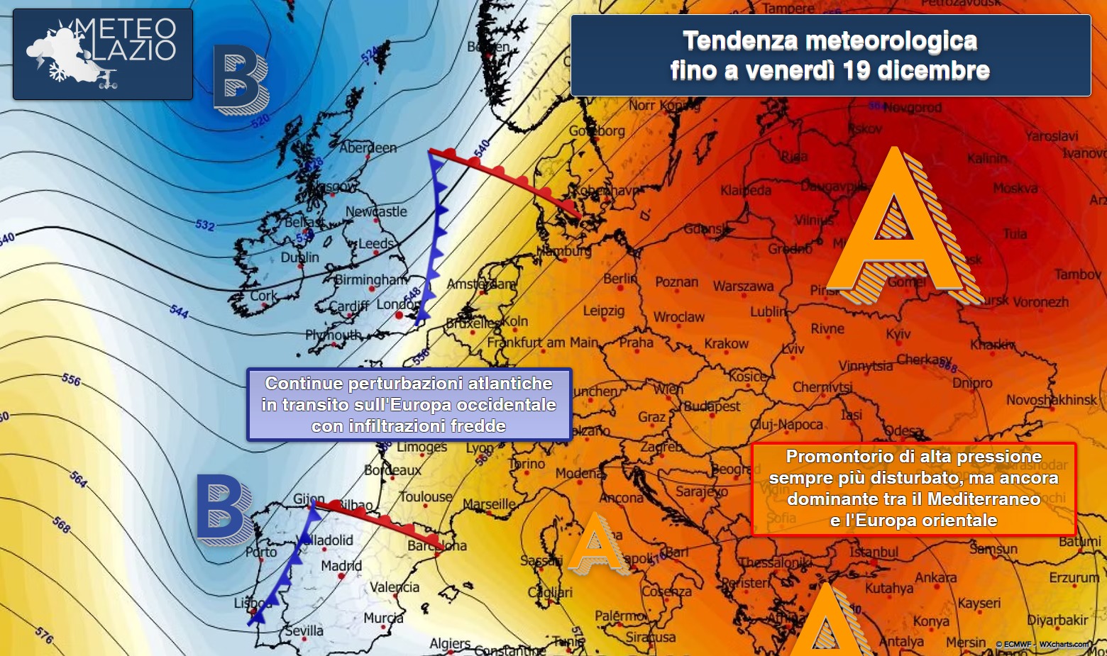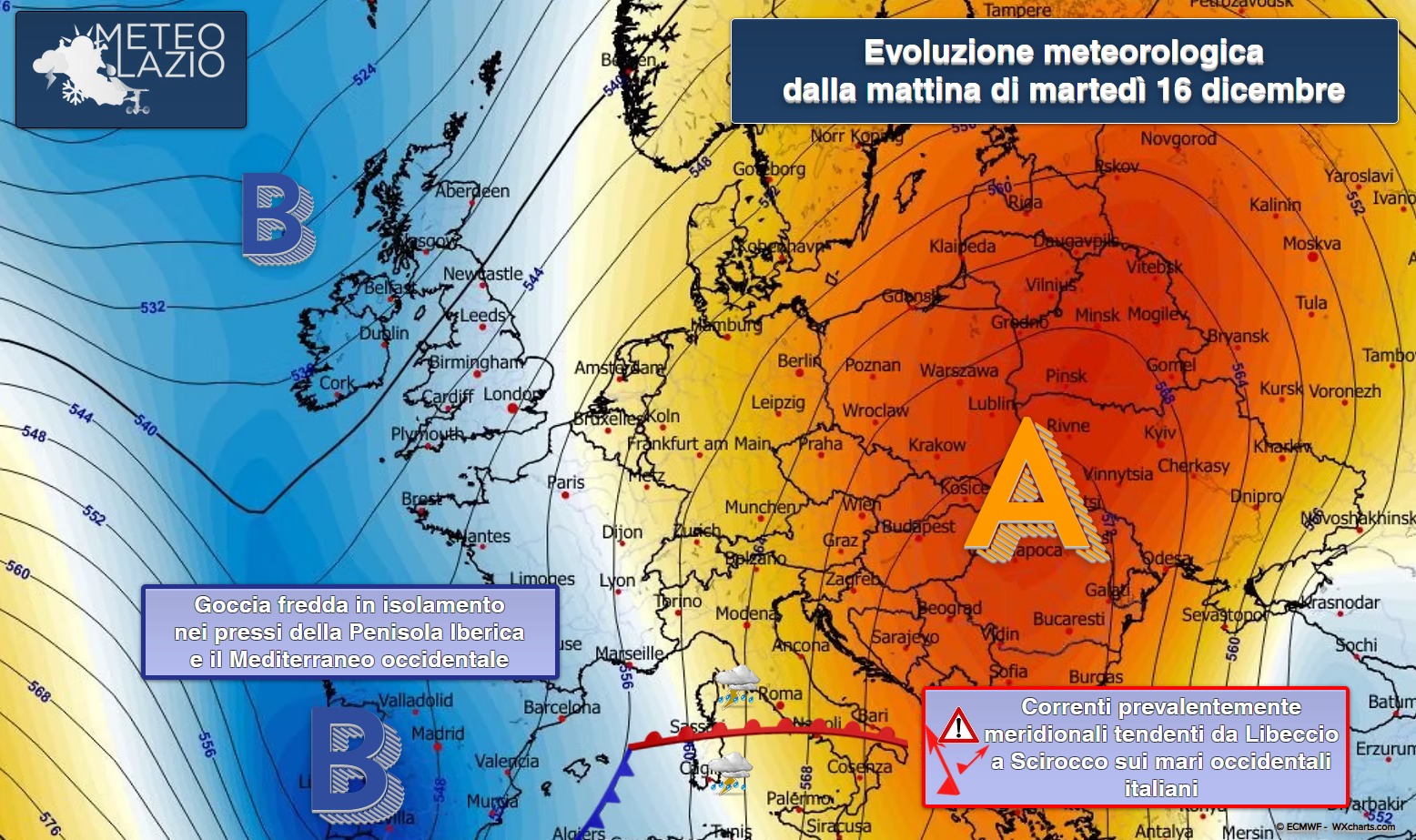 La situazione meteorologica di questo inizio settimana risulta ancora influenzata dal promontorio di alta pressione subtropicale. Ciò nonostante, una vasta circolazione ciclonica collocata poco a nord-ovest delle Isole Britanniche tenderà a veicolare un primo impulso perturbato verso la Spagna a partire dalla giornata di martedì 16 dicembre, con qualche influenza anche a ridosso del Mediterraneo occidentale, dove non mancherà attività temporalesca, concentrata soprattutto in mare aperto sul Tirreno e su parte della Sardegna.