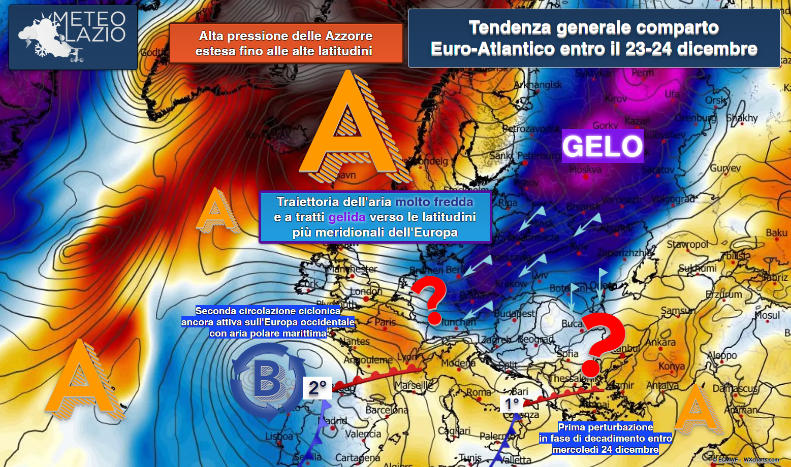 Per questo motivo assisteremo a ondulazioni zonali più marcate, che potranno aprire nuovi corridoi atmosferici sullo scenario euro-atlantico, favorendo un rinforzo dell’alta pressione delle Azzorre verso le alte latitudini scandinave. Contestualmente, aria artica continentale potrebbe essere trasportata verso latitudini più meridionali del continente europeo, indicativamente tra giovedì 25 e venerdì 26 dicembre, compresi gli ultimi giorni del mese.