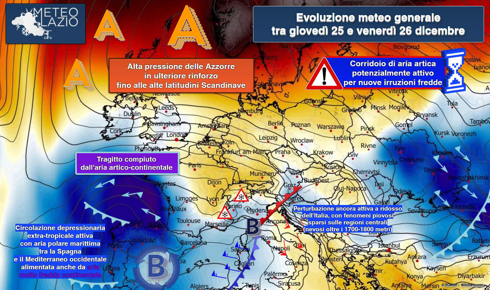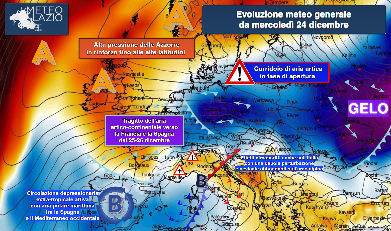 Tale nucleo di aria continentale, entro venerdì 26 dicembre, perderà parte della sua portata, rimescolandosi con aria polare marittima più temperata e meno fredda. Tuttavia, non mancheranno nevicate in Italia su buona parte dell’arco alpino, con accumuli anche abbondanti sulle Alpi occidentali piemontesi e, localmente, anche sui settori alpini centrali e orientali entro Natale.
