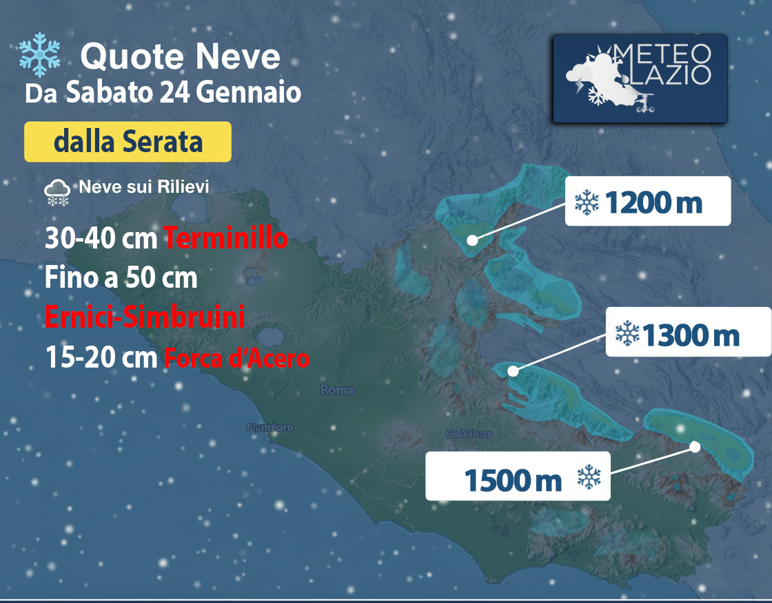 Gli accumuli nevosi potranno risultare particolarmente abbondanti alle quote elevate (al di sopra dei 1700 metri) fino a 30-40 centimetri nella zona del Terminillo; accumuli più abbondanti tra Campocatino (FR), e Campo Staffi (tra i monti Ernici e i Simbruini) dove l’accumulo nevoso potrebbe toccare i 50 centimetri (specie nelle zone più meridionali). Fino a 15-20 centimetri nella zona di Forca d’Acero considerando la quota leggermente meno elevata rispetto agli altri comprensori.
