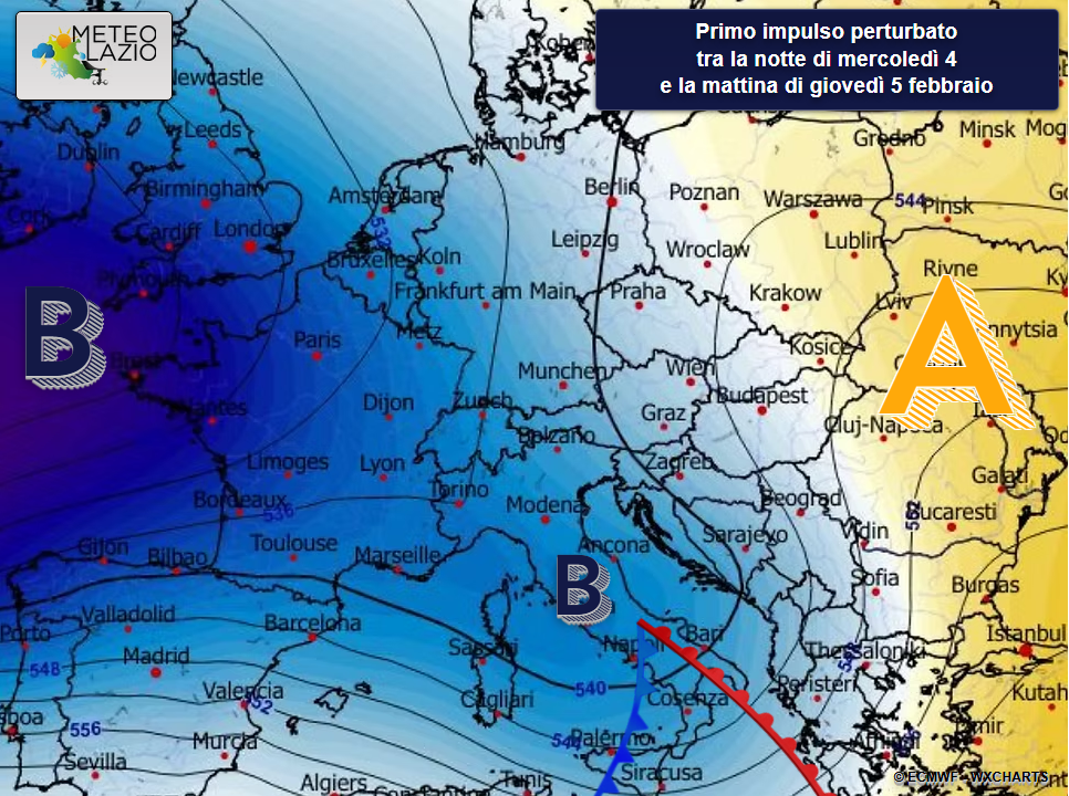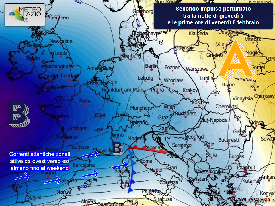 Nel frattempo, un secondo impulso perturbato si appresterà a raggiungere il Mar Tirreno nel corso della notte di giovedì, interessando più direttamente gran parte delle regioni centrali tirreniche (Lazio compreso) fino alle primissime ore di venerdì 6 febbraio. Il miglioramento sarà graduale e non immediato, con schiarite via via più ampie nel corso della sera, quando i cieli diverranno in prevalenza poco nuvolosi.