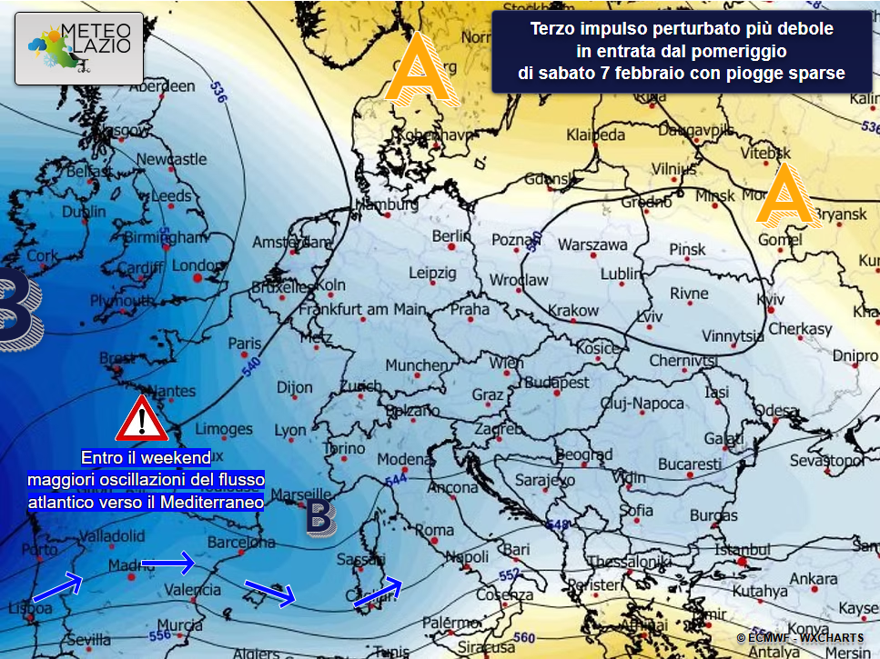 Un terzo impulso perturbato è atteso, in linea di massima, nel corso della mattinata di sabato 7 febbraio. Le piogge più intense dovrebbero tuttavia interessare soprattutto le regioni centro-meridionali dalla Campania in giù, mentre sul Lazio i fenomeni saranno più deboli e intermittenti.