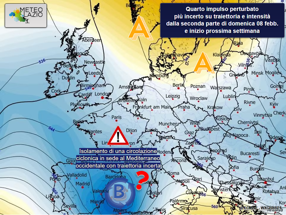 Permane invece una moderata incertezza previsionale per domenica 8 febbraio, poiché il flusso atlantico non sarà più così teso e lineare da ovest verso est in prossimità del Mediterraneo. Sono attese ondulazioni più marcate della corrente a getto; per questo motivo un quarto impulso perturbato potrebbe evolvere in una ciclogenesi più pronunciata, con un minimo barico isolato nei pressi della Sardegna entro il pomeriggio di domenica.