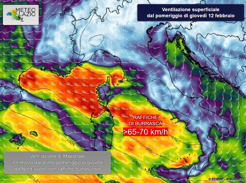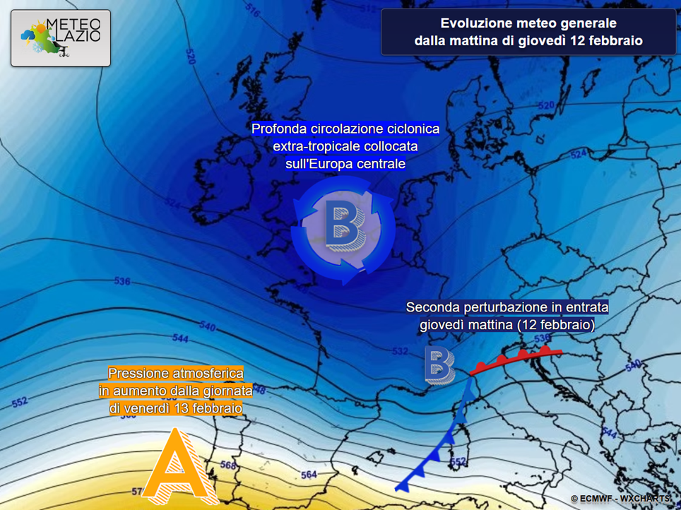 Dalle ore serali e notturne si assisterà all’avvicendamento tra una perturbazione e l’altra, poiché già dalla mattina di giovedì 12 febbraio una seconda perturbazione, più marcata, attraverserà da nord-ovest verso sud-est l’intero Mar Tirreno centrale, questa volta con effetti meteorologici più diffusi su buona parte della regione.