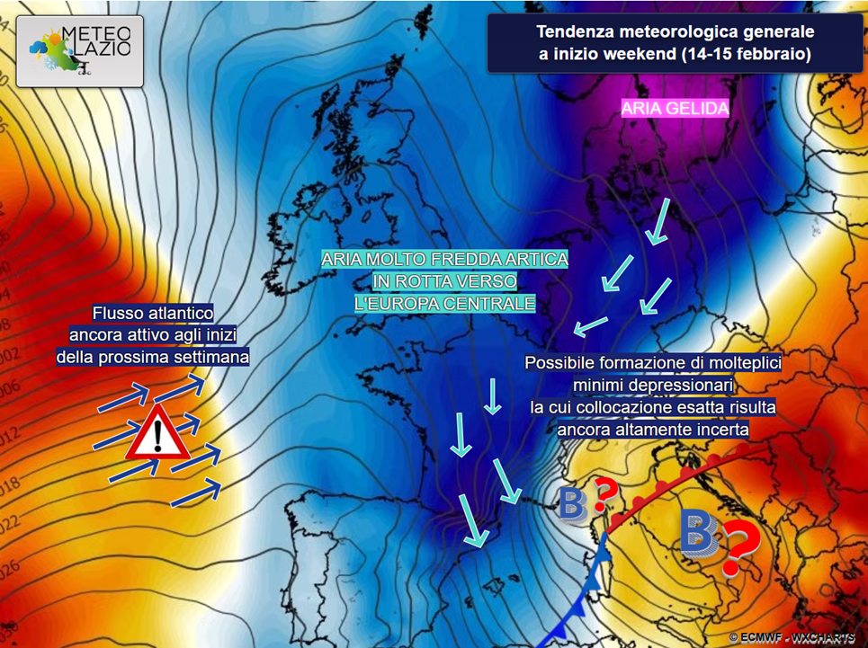 L’innesco di una circolazione ciclonica extra-tropicale su larga scala comporterebbe una fase di maltempo più complessa, con la possibilità di più minimi di bassa pressione tra i bacini occidentali italiani e i settori adriatici, a partire dalla serata di sabato 14 e successivamente nel corso di domenica 15 febbraio.