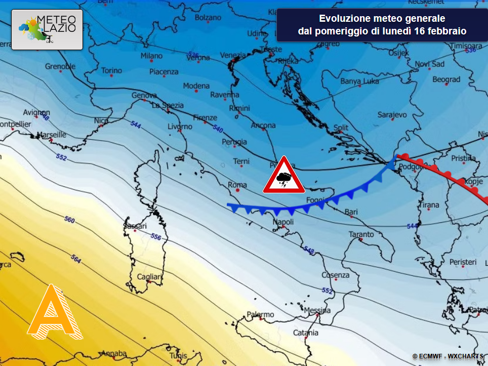 Da lunedì sera, subito dopo l’avanzamento del fronte freddo sull’Italia centrale, affluirà aria più fredda di origine artico-marittima. Ne conseguirà un temporaneo calo termico, più evidente dalla mattina di martedì 17 febbraio, con venti settentrionali tendenti da Maestrale a Grecale.