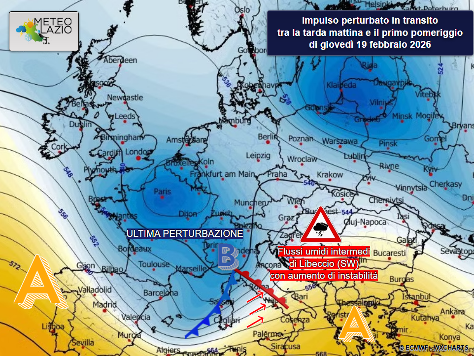 Dalla tarda mattinata di giovedì 19 febbraio una veloce perturbazione attraverserà nuovamente il Mediterraneo occidentale, raggiungendo dal primo pomeriggio le regioni centrali tirreniche. Il suo ingresso determinerà anche un rinforzo dei venti di Libeccio (SW), con raffiche che in montagna potranno superare i 90–100 km/h, mentre risulteranno più contenute sulle pianure.