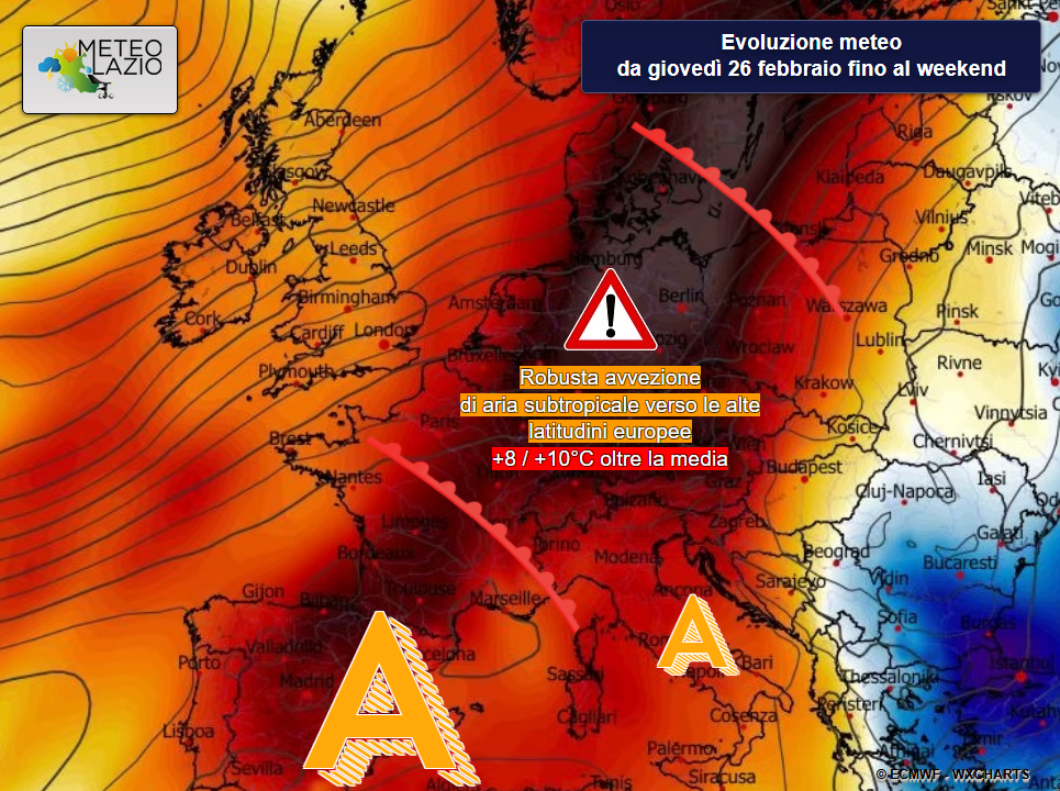 Una massa d’aria mite per il periodo risalirà dal nord Africa verso nord-est, transitando tra Francia ed Europa centro-orientale fino a raggiungere le alte latitudini della Russia europea.