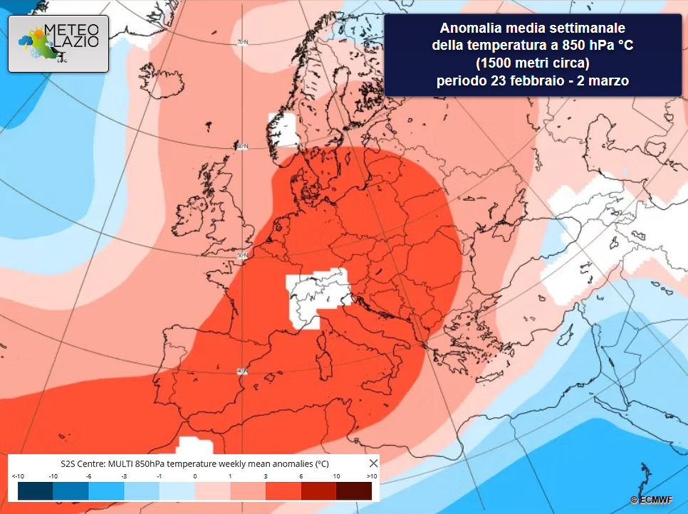 Le mappe di anomalia termica sull’Europa centrale evidenziano infatti una persistente dominanza anticiclonica sul bacino centrale del Mediterraneo, con possibile mantenimento di temperature superiori alla media almeno fino al primo weekend di marzo (indicativamente 7-8 marzo). Eventuali variazioni circolatorie andranno valutate nei prossimi aggiornamenti.