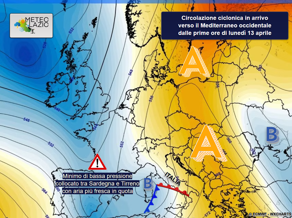 Dalla mattina di lunedì 13 aprile, sul bordo sud-orientale del debole ciclone, assisteremo a un richiamo di aria più calda di origine subtropicale, direttamente dal nord Africa.