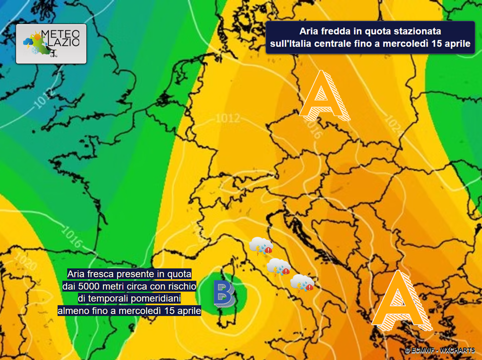Nonostante temperature al suolo miti, comprese tra 20 e 23°C, in alta atmosfera (oltre i 5000 metri di altitudine) affluirà aria più fresca, che favorirà possibili fasi di instabilità a ridosso del Lazio nelle ore pomeridiane di lunedì 13, martedì 14 e mercoledì 15 aprile.