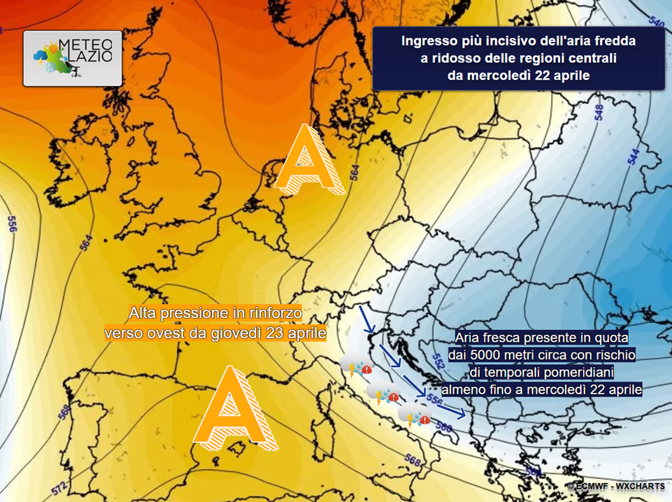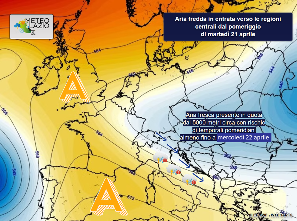 Dall’inizio della settimana il campo di alta pressione subirà qualche sollecitazione da parte di aria più fresca di origine artica, in transito dalle aree settentrionali scandinave del continente europeo verso il Mediterraneo. Ciò determinerà maggiori possibilità di temporali pomeridiani e/o di calore sulle aree interne appenniniche, specie a partire dalle ore centrali di martedì 21 aprile, quando l’afflusso di aria fredda in quota risulterà più marcato in direzione delle regioni centrali italiane, come evidenziato dalla mappa in basso.