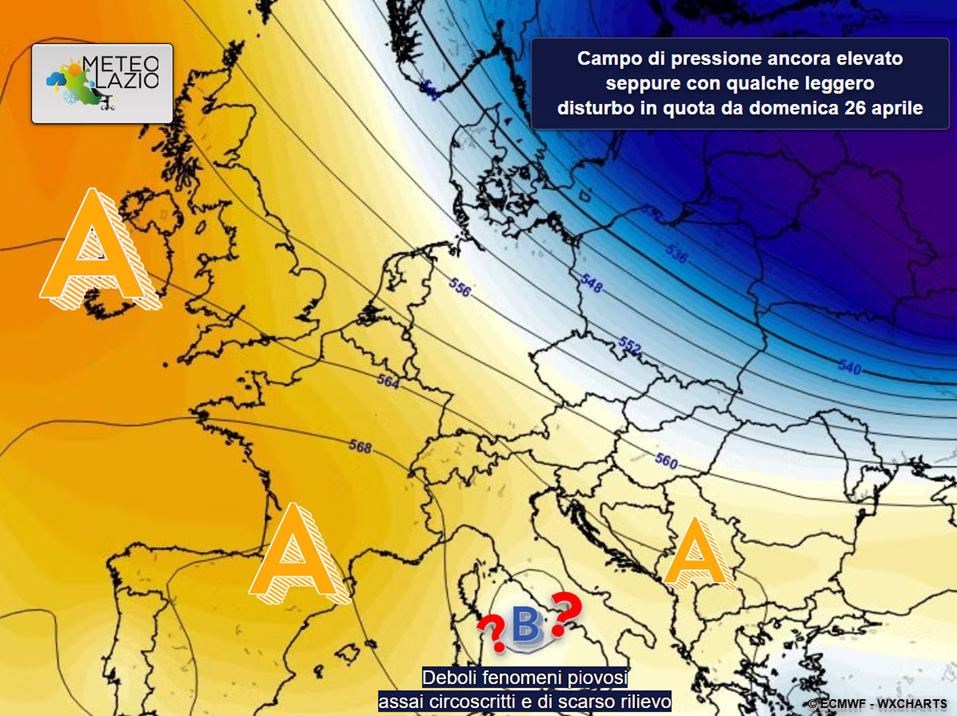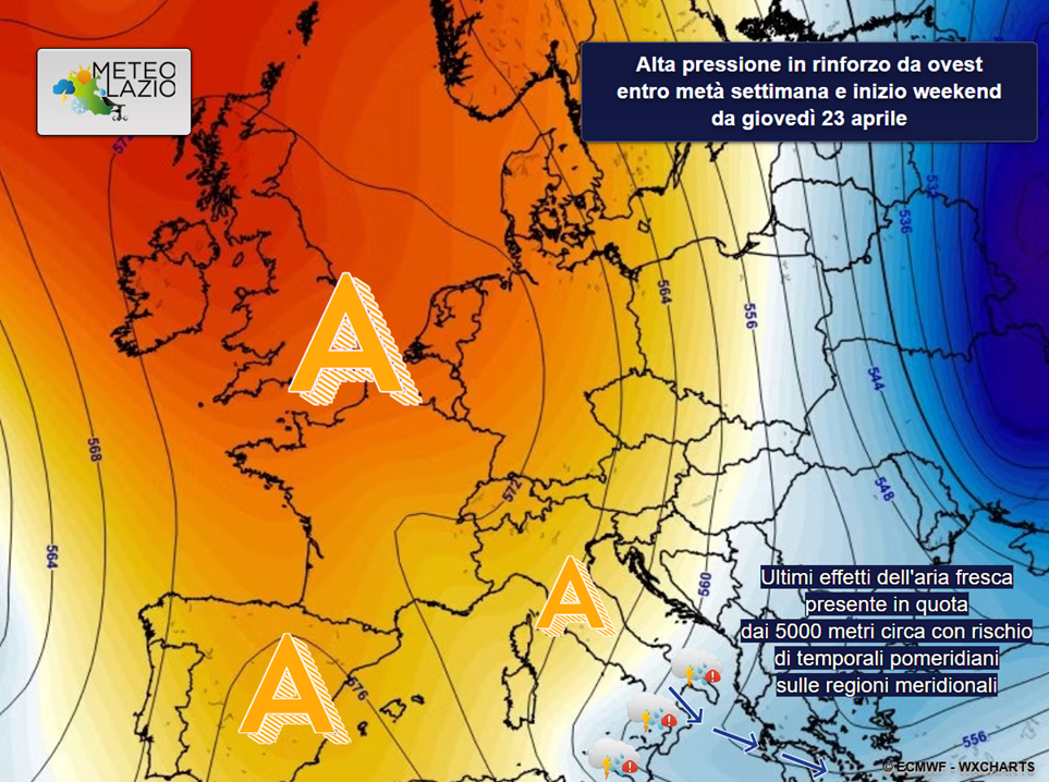 Un campo anticiclonico di alta pressione, esteso da sud-ovest fin verso le regioni centrali italiane, sta favorendo, almeno fino al weekend di sabato 18 e domenica 19 aprile, condizioni di totale stabilità atmosferica, con cieli spesso sereni e temperature, nelle ore centrali del giorno, piuttosto elevate, fin oltre i 28°C, specie sulle principali pianure laziali a ridosso della Valle del Tevere, sui settori orientali della Capitale, sulla Pianura Pontina e su parte delle valli meridionali del Frusinate.